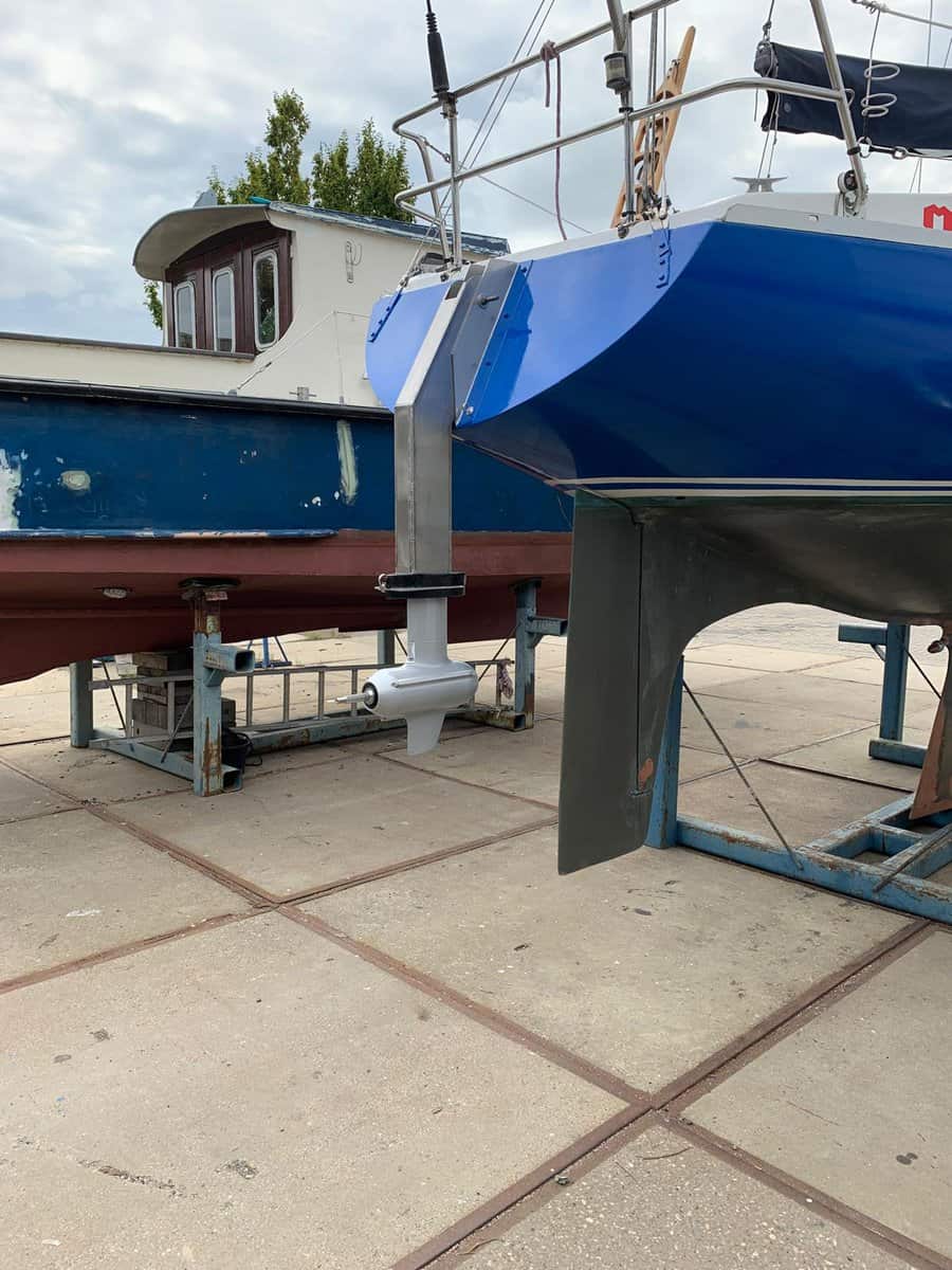 This all involves the battery, battery charger, pod driver, side controls, and the 6.0 kW electric motor, which looks like a saildrive and needs to be bolted under the boat. However, we decided against this. We didn't want an available outboard motor mount because it sticks out unsightly, increases the box size, and is very easy to remove. So I designed a folding motor mount myself, which cannot be removed from the outside and was perfectly welded together from stainless steel by the shipyard. (see photos)