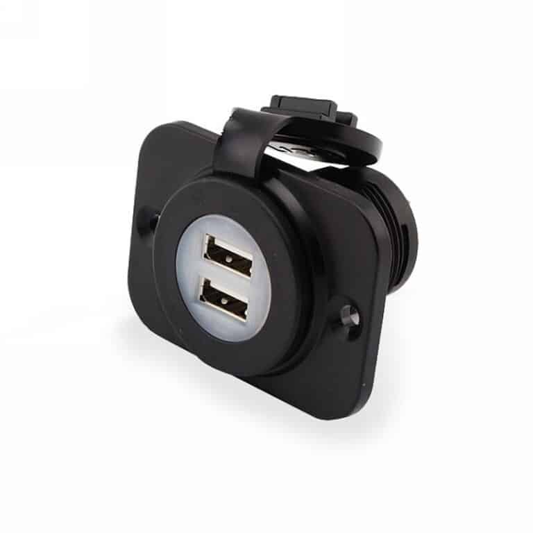 The USB port features a rubber cover and a rectangular front panel that can be removed. Nickel-plated brass connectors prevent corrosion, and the cover protects the sockets from dirt and moisture when not in use. Suitable for cars, campervans, motorhomes, caravans, boats, motorcycles, or any vehicle with 12V/24V power. The socket is mounted in a 29mm panel hole and screwed in place using a threaded swivel ring. The front panel is secured through two holes using the included screws, and the power connection is made via two AMP terminals marked with a pole. Specifications: > Input Voltage: 12V / 24V DC > Output Voltage: 5V DC > Output Current Rating: 2.4A max. (1A per socket if used simultaneously) > Material: Black impact resistant nylon & rubber cover > Panel Diameter: 29mm (drill size) > Front Plate Mounting Hole Diameter: 4.2mm > Mounting Hole for Mounting Plate Center: 48.5mm > Base Diameter without front plate: 36.7mm > Front Plate Depth: 6mm (excluding cover) > Dimensions (LxWxH): 53 x 60 x 43mm